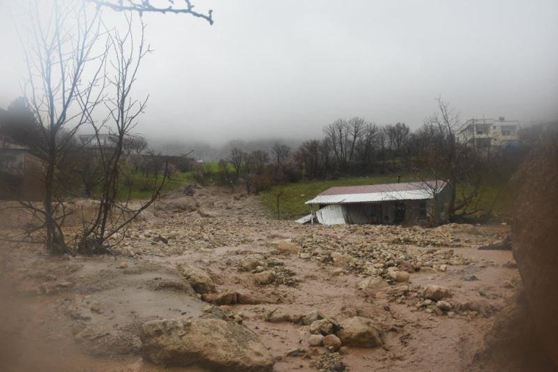 6 Şubat'taki Kahramanmaraş merkezli depremlerden etkilenen Tut ilçesinde aralıklarla devam eden sağanak nedeniyle dere taştı.