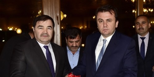Başkan Erkoç konuşmanın ardından ilimize gerçekleştirdiği ziyaretin anısına Türkiye Güreş Federasyonu Başkanı Musa Aydın'a Maraş işi bakır tabak hediye etti.
