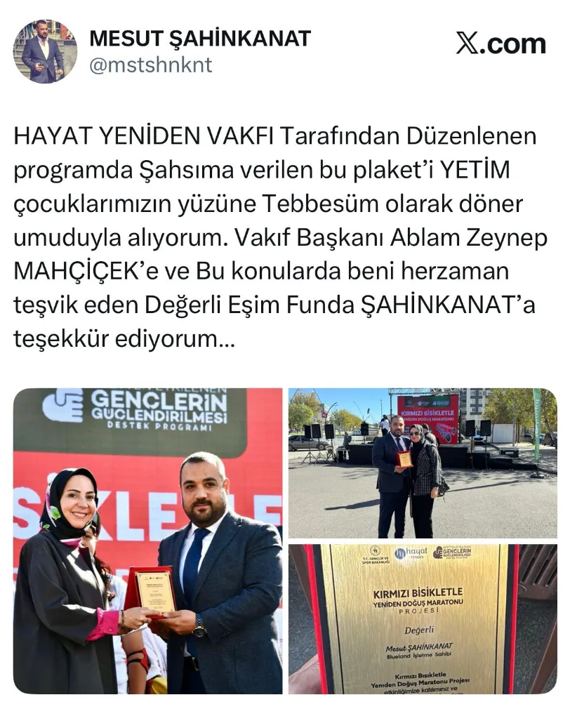 Mesut Şahinkanat, aldığı plaketi duygusal bir mesajla paylaşarak şu ifadelere yer verdi: “Şahsıma verilen bu plaketi, yetim çocuklarımızın yüzüne tebessüm olarak döner umuduyla alıyorum. Vakfın fedakâr Başkanı Zeynep Mahçiçek ablama ve bu konularda her zaman beni teşvik eden değerli eşim Funda Şahinkanat’a teşekkür ediyorum.”