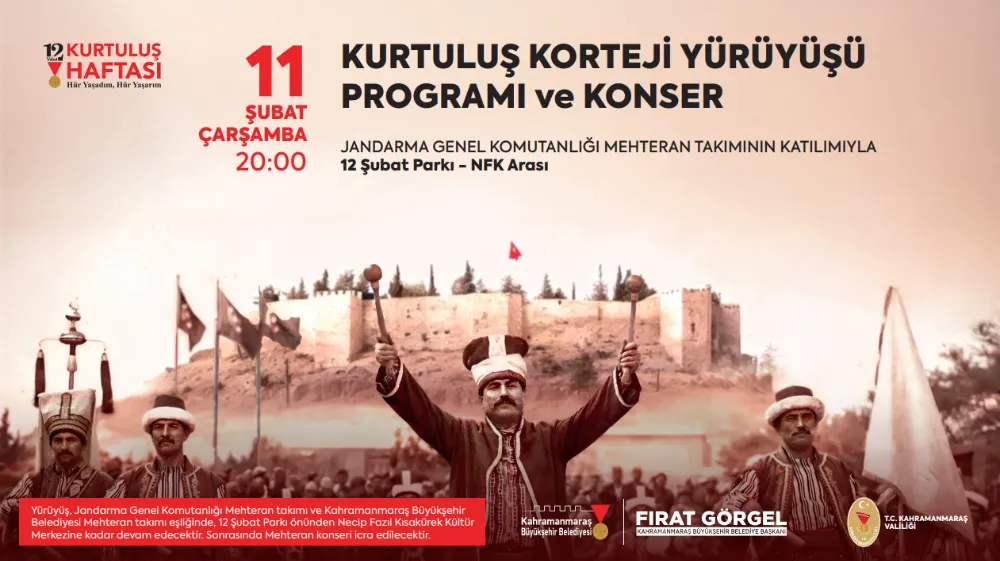 11 Şubat Çarşamba günü, Jandarma Genel Komutanlığı Mehteran Takımı’nın katılımıyla Kurtuluş Korteji Yürüyüşü Programı ve Konser etkinliği ile şehrin bağımsızlık ruhu meydanlara taşınacak. Şehir protokolünün de katlımı ile saat 20.00’da 12 Şubat Parkı’ndan Necip Fazıl Kısakürek Kültür Merkezi’ne kadar kortej yürüyüşü düzenlenecek. Yürüyüş sonrası ise mehteran konseri düzenlenecek. Yürüyüş boyunca vatandaşlar ellerinde Türk bayrakları ve meşalelerle kurtuluş coşkusuna ortak olacak.