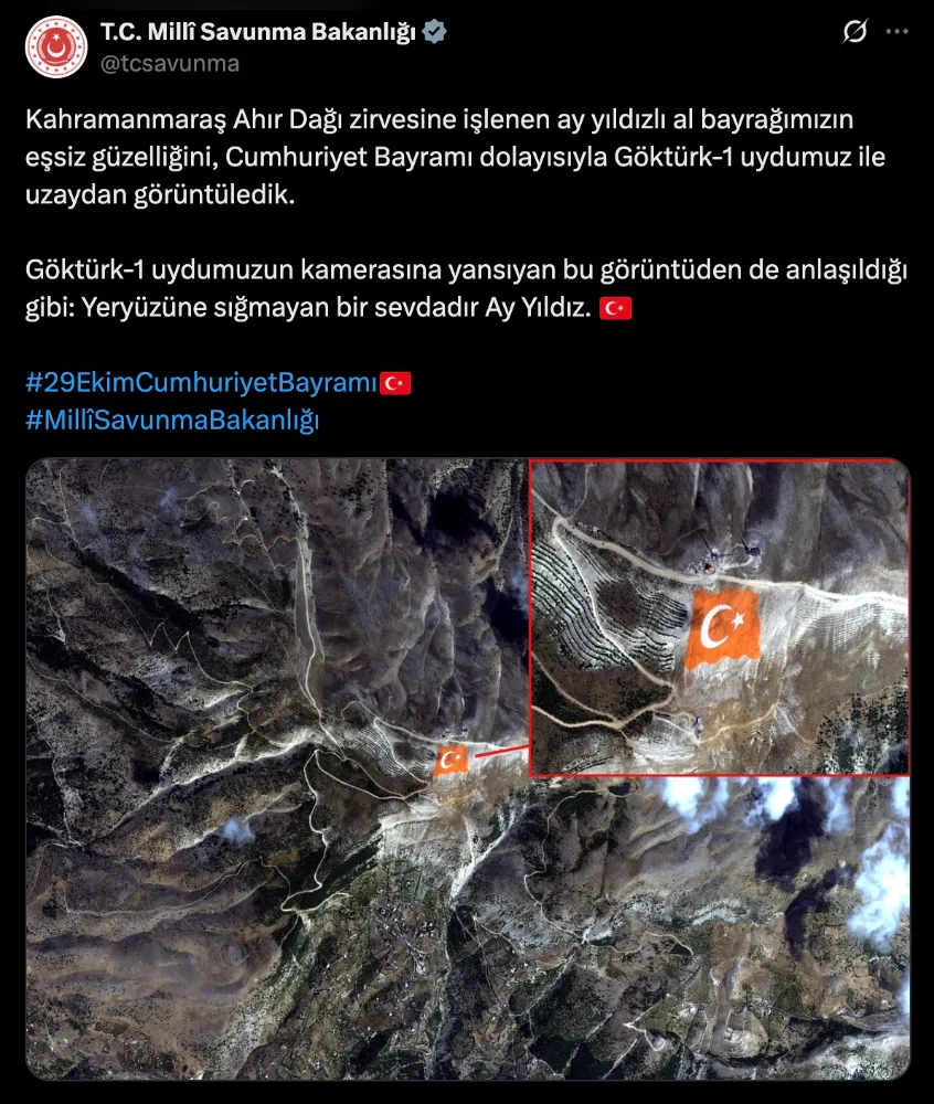 Milli Savunma Bakanlığı’nın resmi sosyal medya hesaplarından yapılan paylaşımda, “Kahramanmaraş Ahır Dağı zirvesine işlenen ay yıldızlı al bayrağımızın eşsiz güzelliğini, Cumhuriyet Bayramı dolayısıyla Göktürk-1 uydumuz ile uzaydan görüntüledik” ifadelerine yer verildi.